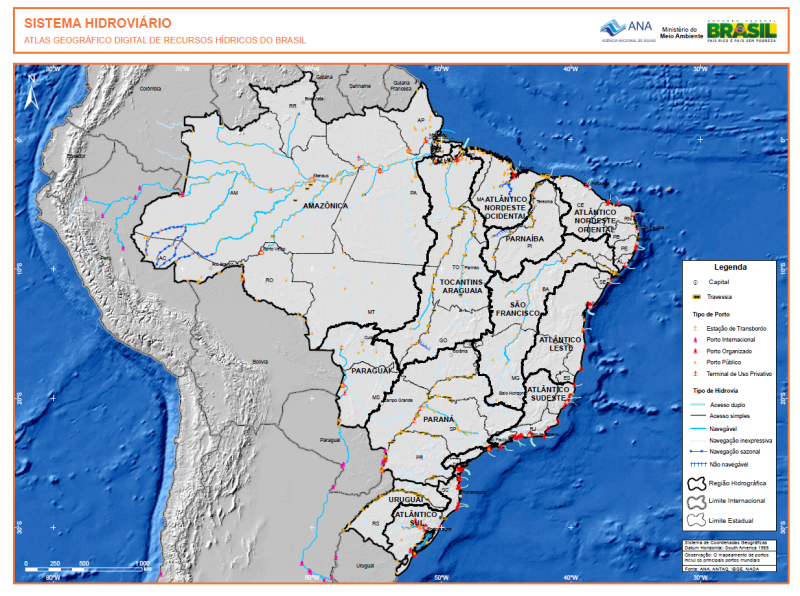 Conforme a Constituição da República Federativa de Brasil de 1988, são de domínio da União os corpos d'água que provém ou constituem limite com território estrangeiro, aqueles que banham mais de uma Unidade da Federação e aqueles localizados em terras da União. O mapeamento também compreende os reservatórios resultantes de obras da União.