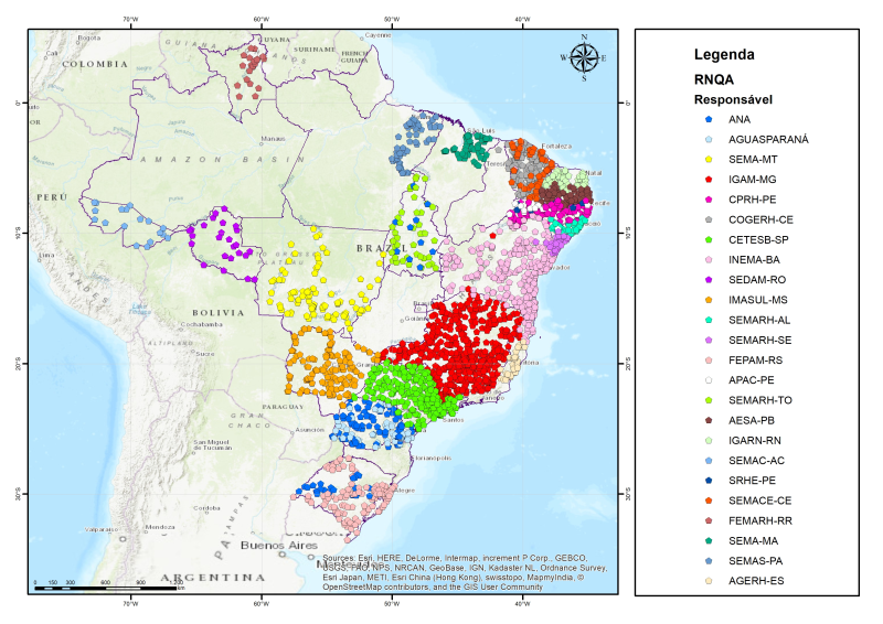 Localização das estações da Rede Nacional de Monitoramento da Qualidade de Água (RNQA) e a Rede Hidrológica Nacional de Referência (RNHR).