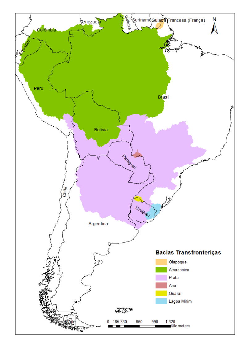 Apresenta as bacias hidrográficas e sistemas aquíferos transfronteiriços do Brasil.