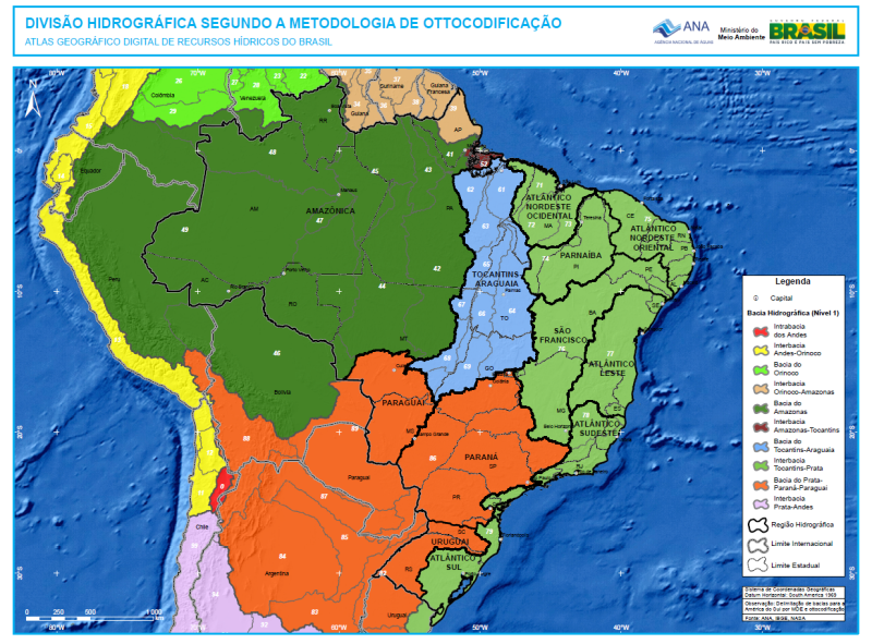 A delimitação de Bacias Hidrográficas para a Agência Nacional de Águas se refere ao primeiro nível da codificação de Ottobacias. Ottobacias são áreas de contribuição dos trechos da rede hidrográfica codificadas segundo o método de Otto Pfafstetter para classificação de bacias. No fim da década de 1980, o engenheiro brasileiro Otto Pfafstetter, funcionário do extinto Departamento Nacional de Obras de Saneamento (DNOS) desenvolveu um método de codificação numérica de bacias hidrográficas, considerando como insumo principal as áreas de contribuição direta de cada trecho da rede hidrográfica. As bacias hidrográficas correspondem à agregação das áreas de contribuição hidrográfica, conhecidas como ottobacias, no nível 1.