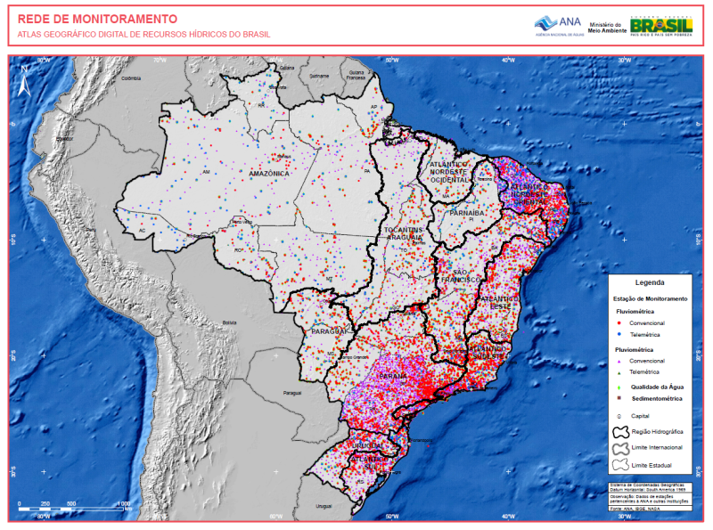 Estações de monitoramento fluviométrico, pluviométrico, sedimentométrico e de qualidade da água operadas pela ANA e outras instituições federais e estaduais com envio de dados de forma convencional ou por telemetria.